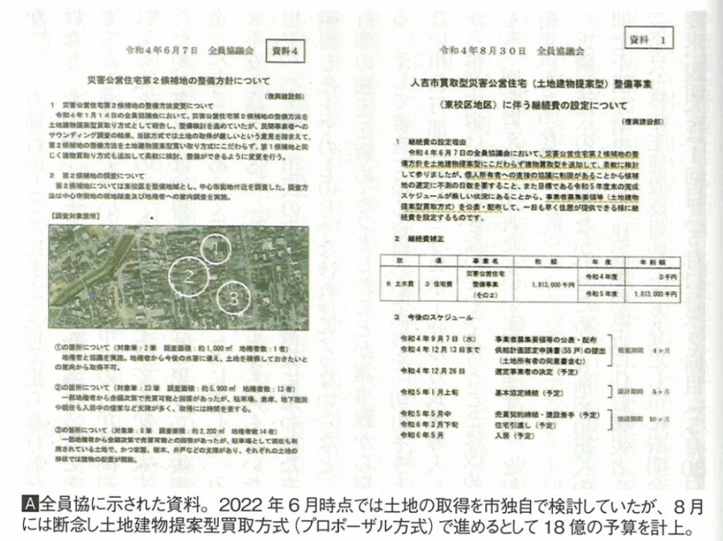 人吉東小学校区に災害公営住宅を建設する方針は、2022年1月14日の市議会全員協議会(全員協)で初めて報告された。被災者への意向調査を踏まえて最大で55戸を土地建物提案型買取方式(プロポーザル方式)で整備するとしたものの、民間企業への市場調査を経て「用地取得が課題」と市は認識[2]、6月7日には、先行していた相良町の公営住宅と同様、市が土地を確保する建物買取型も念頭に整備検討するとして、候補地3カ所の調査状況を全員協で報告する。だが8月30日には、土地取得に不測の日数を要するとして、再び土地建物提案型買取方式で進めることが全員協で報告された。<A>